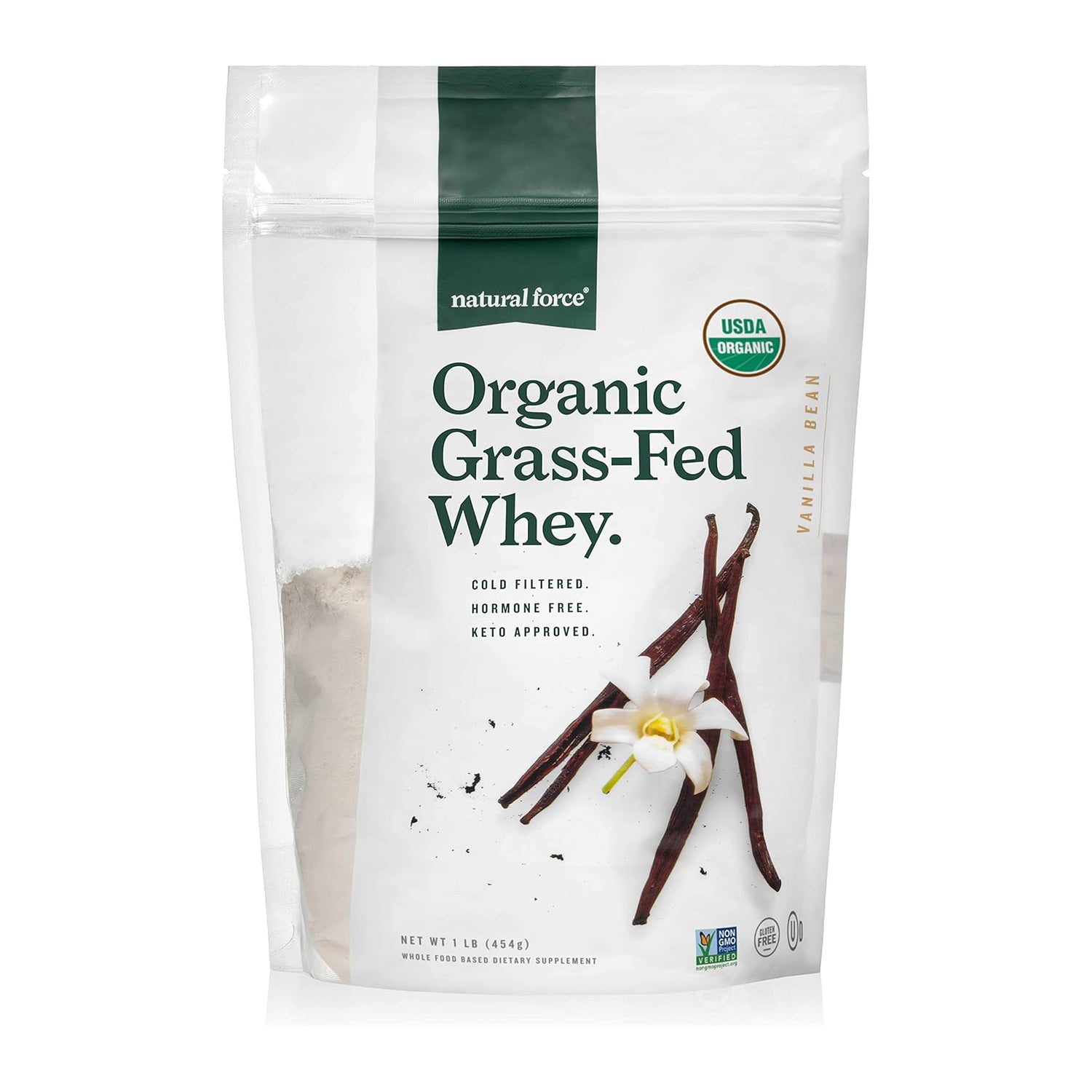 Our Vanilla Bean Organic Whey Protein only has three ingredients: 100% USDA Organic whey protein concentrate, organic vanilla, and organic monk fruit.